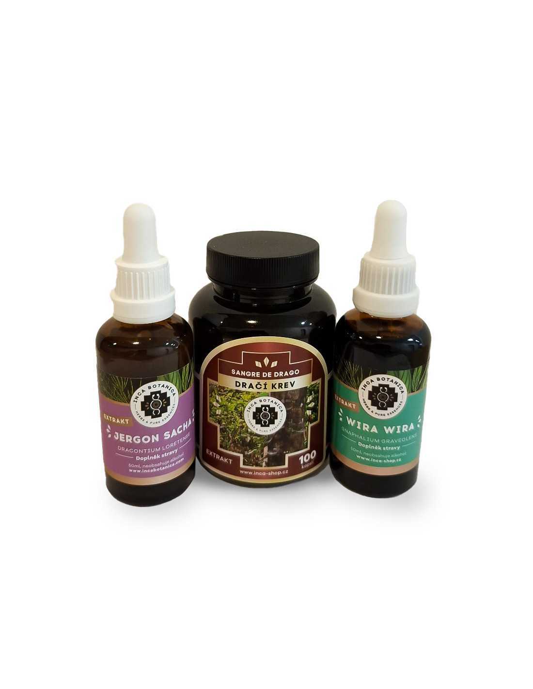 The package contains the following products: wira wira extract, jergon sacha extract, dragon's blood capsules